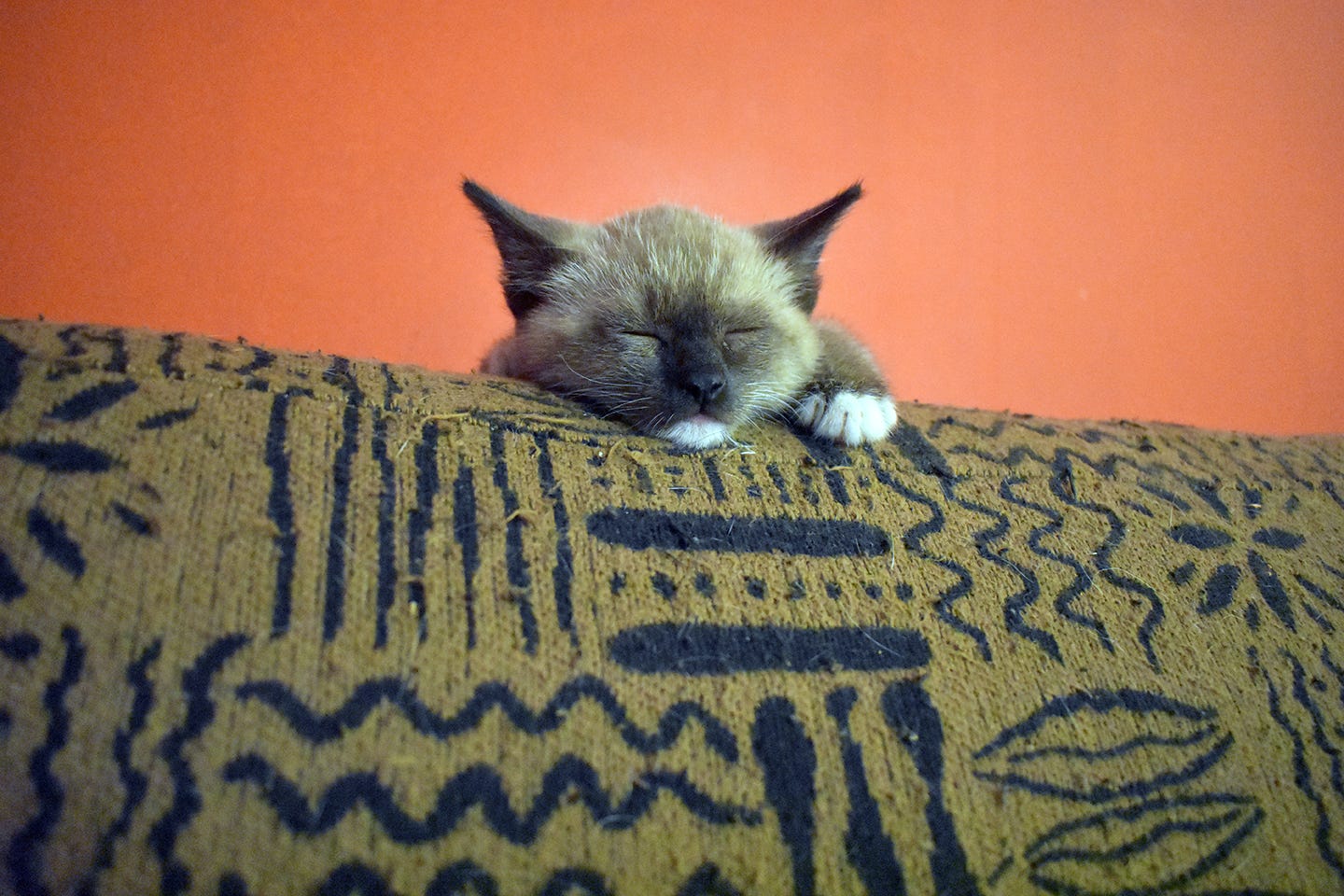 One year ago this date I was cutting oats (I use an electric weed cutter for the oats and a pickaxe for the horehound) when I had to stop and get rid of a large horehound plant. I aimed for the plant base (the roots always grow uphill, so I was on the wrong side of the plant at the moment). It would take a vicious swing of the axe to fell the plant in one go, and I prepared to do just that. But as I raised the axe, a tiny face appeared on my side of the horehound. It didn’t make any sound, but it took several steps toward me and sat on my boot. I was flabbergasted to see a tiny Siamese kitten. No sign of a mother or other kittens, just this one bold, tiny cat.